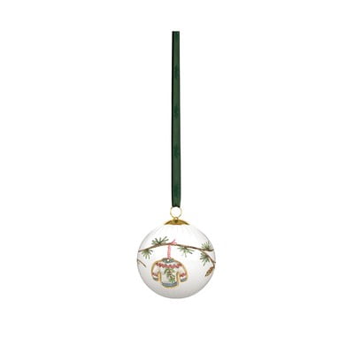 Сферата с диаметър 6 см е украсена с мотив на кедрови клонки с лиственица, на които са закачени най-хубавите орнаменти: парче портокал, завързано с панделка, малка гъбка и две фигурки от домашни меденки във формата на снежен човек и коледен пуловер. Разбира се, има и 2025 г. Тези очарователни мотиви се създават всяка година от художничката Рике Якобсен.