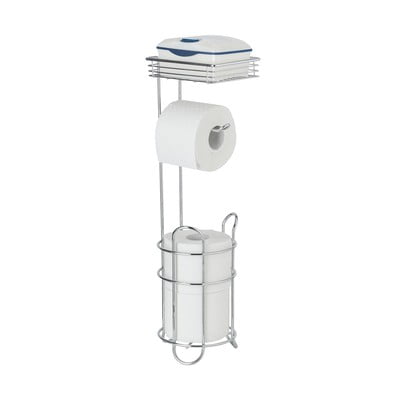 Стабилен, свободностоящ държач за тоалетна хартия, горният рафт е точно за кутия мокра тоалетна хартия, долният кош побира лесно 3 резервни ролки. Отг...