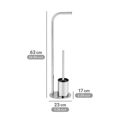 Този свободностоящ стоманен аксесоар елегантно съчетава поставка за тоалетна хартия с вградена четка за тоалетна. Четката е разположена в отделен контейнер в основата на поставката, а главата ѝ е с диаметър 7,5 см.