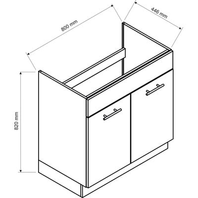 Самият корпус е бял и е изработен от ламинирана плоскост с дебелина 16 мм. Тъй като се доставят поотделно, можете да подредите шкафовете по свой вкус. При шкафовете със странично отваряне можете също така да изберете дали да се отварят от лявата или от дясната страна.