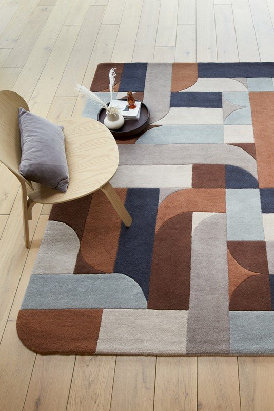Вълненият килим от известната серия Matrix се отличава със смели геометрични шарки и неутрална цветова палитра. Той е завършен ръчно с помощта на техники, които подчертават неговата текстура и сложни детайли.