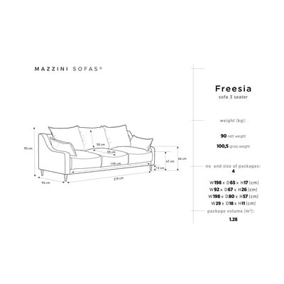 Диван Mazzini Sofas Freesia предлага здрава конструкция от дърво и ПДЧ, която може да издържи до 350 кг! Висококачественият пълнеж от мека пяна осигурява максимален комфорт. Заслужавате момент на релаксация. Отпуснете се със стил на диван Freesia.