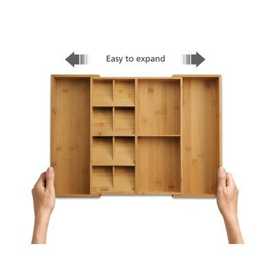 DrawerStore Bamboo от Joseph Joseph е удобен органайзер, който ви помага да поддържате кухненското си чекмедже подредено. Благодарение на интелигентната подредба, при която приборите за хранене се поставят под ъгъл един върху друг, спестявате повече от половината пространство. Приборите за хранене могат да се поставят в маркираните отвори от двете страни.