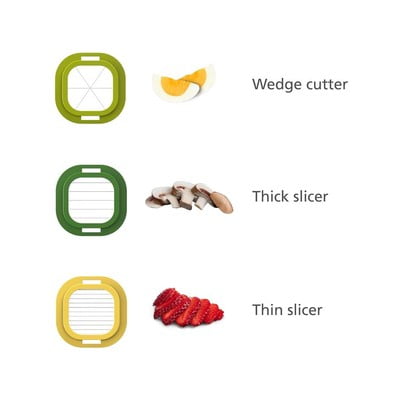 Тази ръчна резачка на Joseph Joseph е удобен помощник за лесно нарязване на яйца, меки плодове или гъби. Тя разполага с три различни режещи инструмента от неръждаема стомана, които ви позволяват да режете на клинове, тънки ленти или по-дебели резени. За удобно боравене и чистота по време на работа резачката разполага с прозрачна тава с нехлъзгаща се основа. Когато работата е свършена, всички части могат лесно да се сгънат в компактна форма, която спестява място за съхранение.