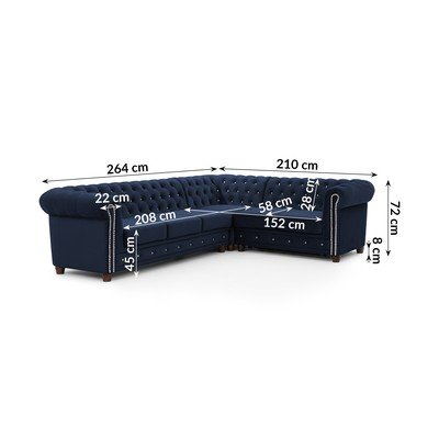 Кадифен, сгъваем, честърфийлд, десен ъгъл/L форма, син, водоустойчив/устойчив на петна, четириместен, ширина 264 cm
