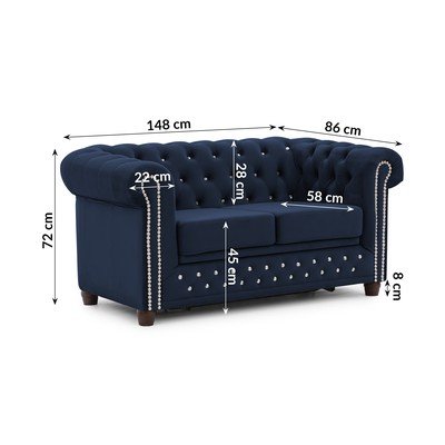 Кадифен, сгъваем, честърфийлд, син, водоустойчив/устойчив на петна, двуместен, ширина 148 cm