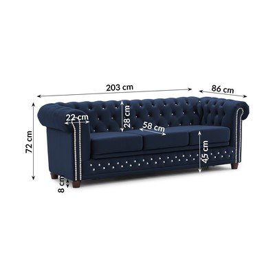 Кадифен, сгъваем, честърфийлд, син, водоустойчив/устойчив на петна, двуместен, ширина 203 cm