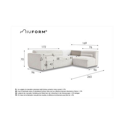 Десен ъгъл/L формаТъмносивЧетириместенШирина 265 cmДълбочина 169 cmДълбочина на седалката 58 cm