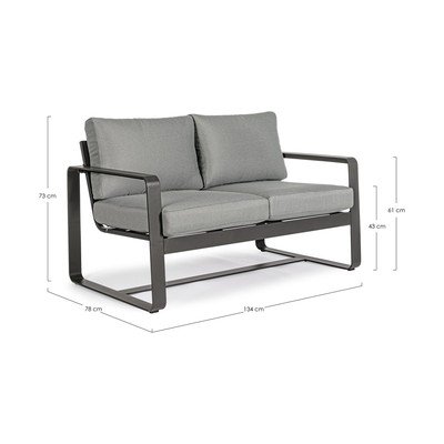 Със семпла рамка от издръжлив алуминий, диванът се допълва от удобни възглавници в неутрално сиво, които завършват минималистичния му вид. Благодарение на използването на алуминий диванът е едновременно лек и устойчив на атмосферни влияния.