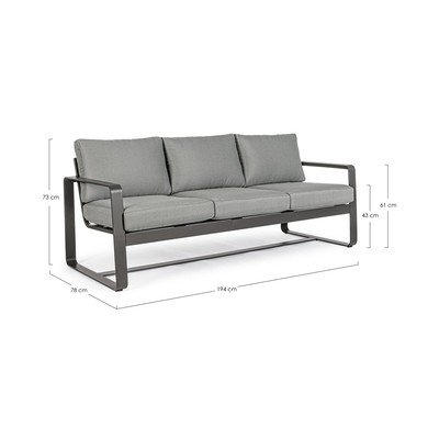 Със семпла рамка от издръжлив алуминий, диванът се допълва от удобни възглавници в неутрално сиво, които завършват минималистичния му вид. Благодарение на използването на алуминий диванът е едновременно лек и устойчив на атмосферни влияния.