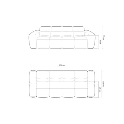 Сив, триместен, ширина 256 cm, дълбочина 101 cm, дълбочина на седалката 58 cm