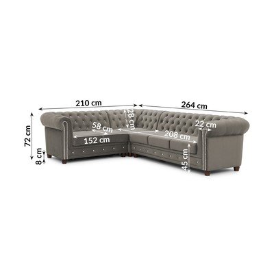 Кадифен, сгъваем, честърфийлд, ляв ъгъл/L форма, сив, водоустойчив/устойчив на петна, четириместен, ширина 264 cm