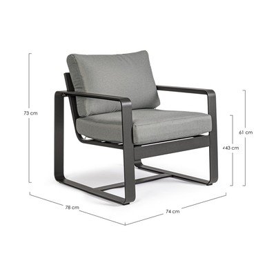 Металното градинско кресло Merrigan в елегантен антрацит от Bizzotto внася модерен стил във вътрешния двор. Фотьойлът е допълнен от удобна сива възглавница за комфортно сядане. Материалът и конструкцията правят фотьойла устойчив на атмосферни влияния и подходящ за употреба на открито.