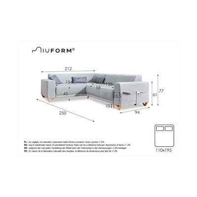 Сгъваем/с място за съхранениеЛяв ъгъл/L формаСивЧетириместенШирина 250 cmДълбочина 212 cmДълбочина на седалката 58 cm