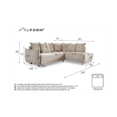 От рипсено кадифеСгъваем/с място за съхранениеДесен ъгъл/L формаСивЧетириместенШирина 247 cmДълбочина 191 cmДълбочина на седалката 79 cm