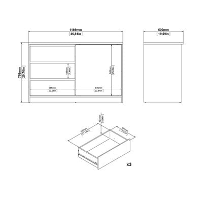 На лявата страна ще откриете три просторни чекмеджета, докато дясната страна крие шкаф с плъзгащи се врати и фиксиран рафт. Семплият и модерен дизайн се вписва в различни интериори.