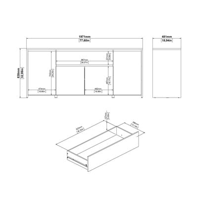 С размерите си от 197x84x48 см той предлага достатъчно място за вашите вещи. Скринът разполага с четири затворени отделения с рафтове и едно практично чекмедже. Белият цвят в комбинация с дъбовия декор създава елегантна визия. Двата големи шкафа отстрани и двата по-малки в средата осигуряват разнообразни възможности за съхранение.