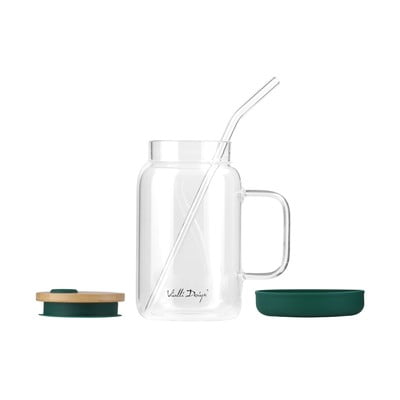 Включена е и елегантна стъклена сламка - препоръчваме да се борави внимателно с нея поради нейната чупливост. Чашата е изработена от устойчиво боросиликатно стъкло и е стабилна благодарение на пластмасовата си основа.