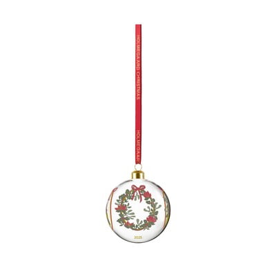 Кълбото е украсено с мотиви на художничката Йет Фрьолих, изобразяващи празничен венец от буйна зеленина, коледни рози и плодове от кокичета, както и млада двойка, държаща се за ръце под елха. Върху сферата е отбелязана годината 2025. Тази ръчно издухана стъклена украса с диаметър 8 см е допълнена от елегантна копринена панделка със златен релеф, която идеално се съчетава със златния връх на сферата.