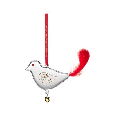 Тази стъклена птица е изработена от ръчно духано стъкло, което гарантира нейната уникалност. Визуално украшението е украсено с червено сърце за око, златни сърца по тялото, истинско червено перо като опашка и малка златна висулка във формата на сърце, която виси отдолу. В комплекта е включена и копринена панделка, за да можете да окачите украшението на дървото, на прозореца или на клоните на иглолистните дървета. Тя ще допълни красиво останалите елементи от колекцията "Носталгична Коледа". Ann-Sofi Romme създава коледната си колекция за Holmegaard от 1993 г. и всяка от тях носи оригинална коледна история, която събужда радост и спомени за романтични коледни моменти у мнозина.