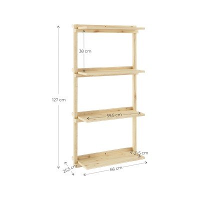 Етажерката е изработена от качествена борова дървесина в естествен цвят, което ѝ придава елегантен и вечен вид. Размерите му от 66 x 127 см позволяват ефективно използване на пространството на стената.