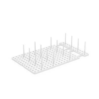 Капакът и поставката за тигани Peggy от Umbra могат да се адаптират почти идеално към съхраняваните съдове. Върху неплъзгащата се основа ще откриете общо 108 отвора, в които можете да поставите шестнадесетте включени колчета според предпочитанията си.