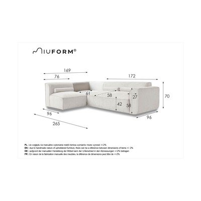 Ляв ъгъл/L формаСветлосивЧетириместенШирина 265 cmДълбочина 169 cmДълбочина на седалката 58 cm