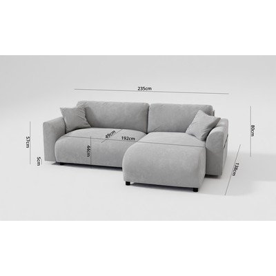 Кадифен, сгъваем/с място за съхранение, десен ъгъл/ляв ъгъл/променлив, сив, триместен, ширина 235 cm