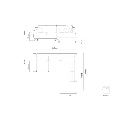 Кадифен, сгъваем/с място за съхранение, десен ъгъл/L форма, светлосив, четириместен, ширина 243 cm