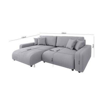 От рипсено кадифе, сгъваем/с място за съхранение, десен ъгъл/ляв ъгъл/променлив, светлосив, триместен, ширина 234 cm