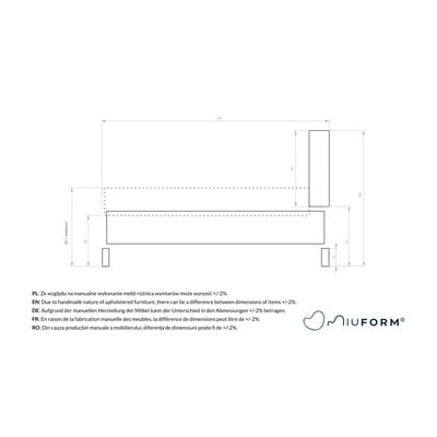 Това легло от Miuform впечатлява с меката си на допир плетена табла с триизмерна структура. След това конструкцията му се състои от солидна тапицирана рамка и пружинни ламели, които надеждно поддържат матрака. Всичко това се допълва от тесни метални крачета, които повдигат леглото за по-лесна поддръжка.