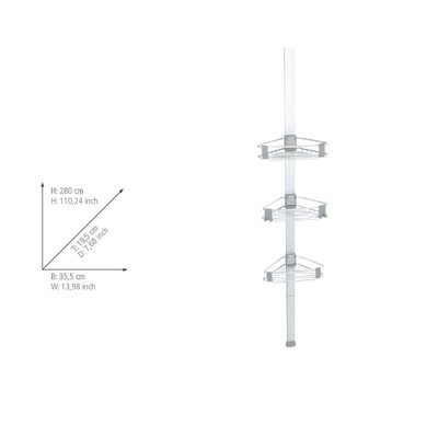 Рафтът разполага с три регулируеми ъглови нива, които могат да се преместват встрани и са снабдени с овална опора с профил. На един от тези рафтове има и удобни кукички, на които можете да закачите гъбата за душ, кърпата за миене или други дребни предмети. Благодарение на телескопичната си конструкция височината му се регулира от 188 до 280 см, така че лесно може да се адаптира към вашите нужди.