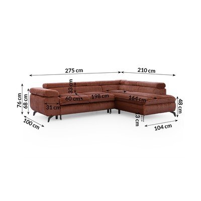 От рипсено кадифеПозициониране/сгъваем/с място за съхранениеДесен ъгъл/L формаТеракотенПодходящ за домашни любимци/устойчив на петнаЧетириместенШирина 275 cm