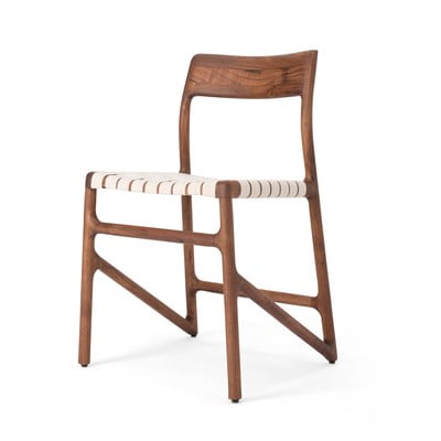 Столът е изработен от масивно маслодайно орехово дърво, което гарантира устойчивост и дълготрайност. Седалката е съставена от тъкани памучни ремъци, които осигуряват удобно сядане.