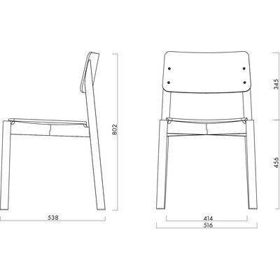 Седалката и облегалката са изработени от формован шперплат с буков фурнир, който придава на стола приятен външен вид и комфорт. Краката са изработени от масивна букова дървесина, което гарантира стабилност и издръжливост. Семплият дизайн с леко извити седалка и облегалка се допълва от фини детайли, като например видимите винтове на облегалката.
