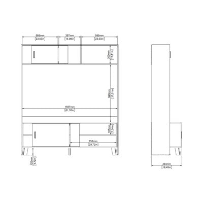 Този голям шкаф с размери 159x181x48 см с покритие от бял дъб предлага много място за съхранение на вашата електроника и аксесоари. Горната и долната част съдържат плъзгащи се врати за лесен достъп, а отворените рафтове осигуряват място за декорации или често използвани предмети. Долното отделение за съхранение с преграда и два рафта е идеално за дискретно съхранение.
