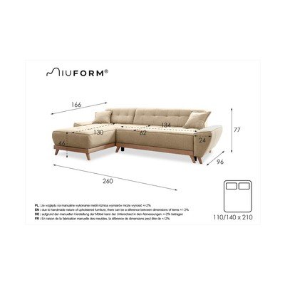 Сгъваем/с място за съхранениеДесен ъгъл/ляв ъгъл/променливТюркоазенТриместенШирина 260 cmДълбочина 166 cmДълбочина на седалката 62 cm