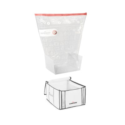 Удобно изсмукване на излишния въздух с домашната прахосмукачка. Благодарение на еднопосочния клапан не е необходимо да се притеснявате, че чантата ще се надуе отново, след като въздухът е бил изсмукан. Също така разполага с прозрачни прозорци за лесно разпознаване на съдържанието и интегрирани каишки с шнур за вертикално съхранение.
