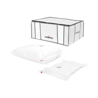 Удобно изсмукване на излишния въздух с домашната прахосмукачка. Благодарение на еднопосочния клапан не е необходимо да се притеснявате, че чантата ще се надуе отново, след като въздухът е бил изсмукан. Също така разполага с прозрачни прозорци за лесно разпознаване на съдържанието и интегрирани каишки с шнур за вертикално съхранение.
