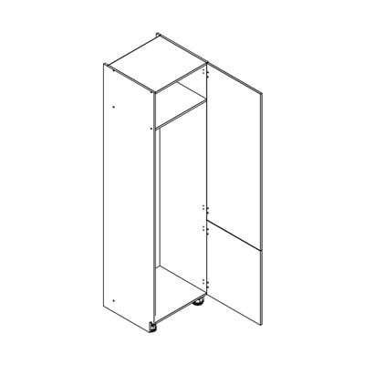 Колекцията модулни кухненски шкафове Kai се характеризира с приглушени цветове и фини фрезовани детайли. Зад вратите с меламиново фолио с дебелина 19 мм има място за инсталиране на вграден хладилник. Благодарение на пантите с меко затваряне затварянето е тихо и плавно, без почукване. Самият шкаф е бял и е изработен от ламинирана плоскост с дебелина 16 мм.