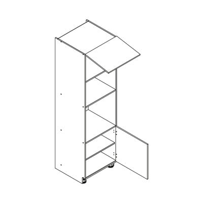 Той предлага и два шкафа, разположени в горната и долната част. Докато горната предна част на панти се отваря с газови бутала, вратата в долната част се отваря класически настрани. Всеки от тях съдържа рафт, скрит зад врата от меламинова плоскост с дебелина 19 мм. Благодарение на пантите със система Soft Closing затварянето е тихо и плавно, без почукване. Елегантният външен вид е подчертан от фрезованите дръжки. Самият корпус е бял и е изработен от ламиниран картон с дебелина 16 мм.