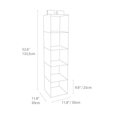 Практичният висящ органайзер ви помага да съхранявате дрехите си благодарение на петте си отделения. Той е идеален за окачване в гардероба или на закачалка. Конструкцията е изработена от картон и издръжлив полиестер. Задържа се здраво благодарение на велкро закопчалката. Продуктът може да се сгъва по всяко време, ако е необходимо, за да се спести място.