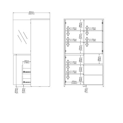 Той разполага с три затворени отделения с регулируеми рафтове, едното от които има стъклена врата за излагане на любимите ви предмети. Освен това включва отворено пространство за лесен достъп и две просторни чекмеджета. Модерната визия с изчистени линии подхожда на различни интериори, а дълбочината от 48 см осигурява достатъчно място за съхранение, без да заема излишно пространство в стаята.