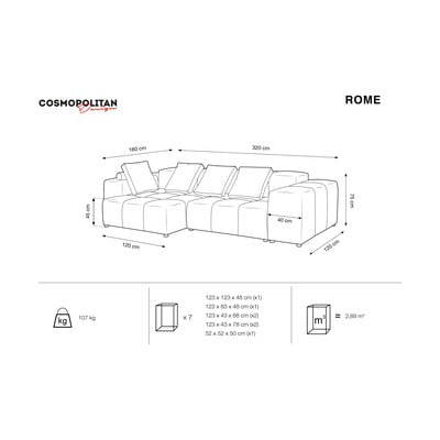 Изпитайте истински комфорт с ъгловия диван Rome. Диванът е съставен от няколко модула, облегалки и подлакътници, които можете да закупите и поотделно, за да създадете по-просторен ъглов диван или по-уютна част, която да отговаря на вашите нужди и интериор. Можете да допълните дизайна с мека текстилна повърхност с възглавници от серията Rome, която предлага много различни форми, размери и цветови варианти. Можете да опитате и кадифената версия на дивана Rome Velvet.