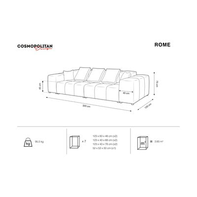 Открийте комбинацията от функционалност и елегантност и изберете един от многото цветови варианти на дивана Rome. Диванът е съставен от няколко модула, облегалки и подлакътници, които можете да закупите и поотделно, за да създадете своя собствена част, която ще отговаря както на вашите нужди, така и на вашия интериор. От модулите можете да изградите по-малък или по-голям диван, ъглов диван или дори U-образен диван. Гамата Rome предлага и голямо разнообразие от възглавници в много размери и цветове, за да придадете на дивана си по-уютен вид и още повече комфорт. Можете да опитате и кадифената версия на дивана Rome Velvet.